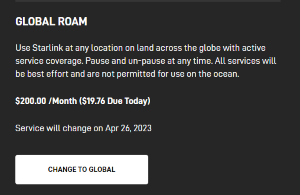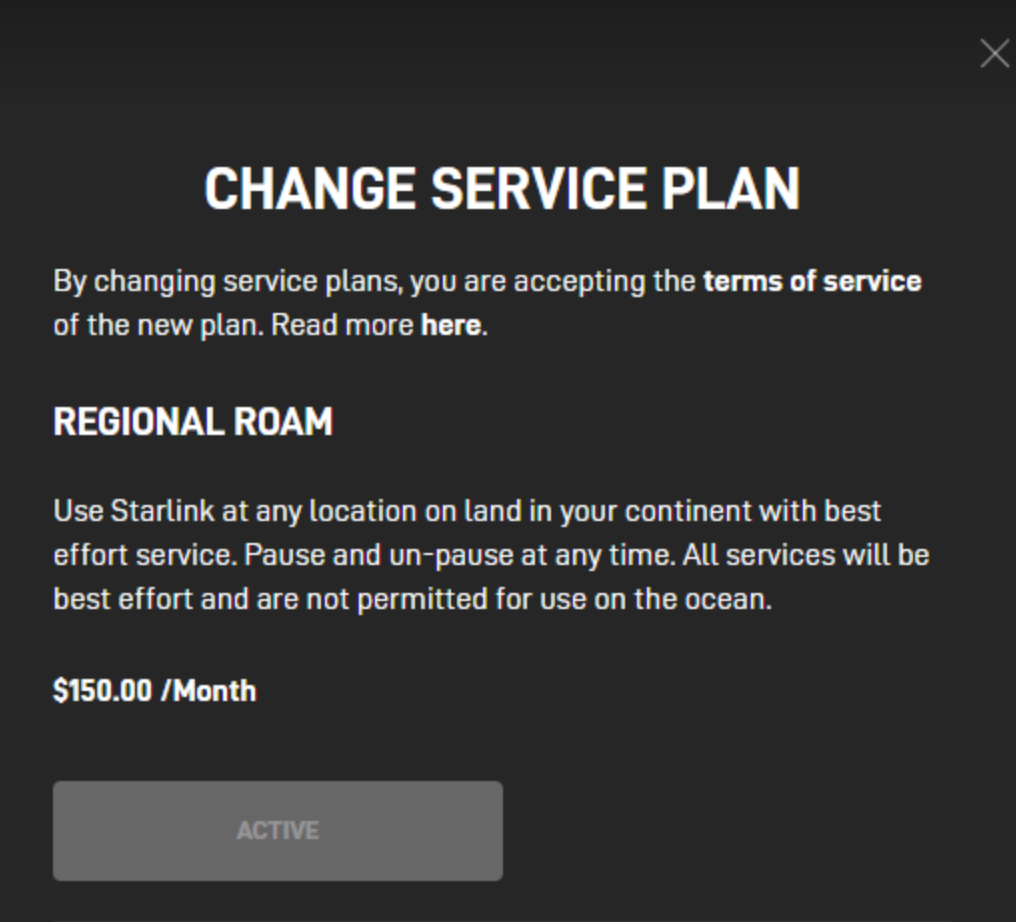 Starlink has now added the option for users to change between Regional Roam, Global Roam, Maritime / Mobility 50GB, & Starlink Residential plans.