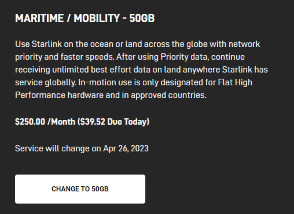 - We expect users wanting to change to the Maritime / Mobility 50GB plan (requires approved in-motion dish) won't be allowed to change unless they have the flat HP dish at the time of the request even though the option is there on their list.