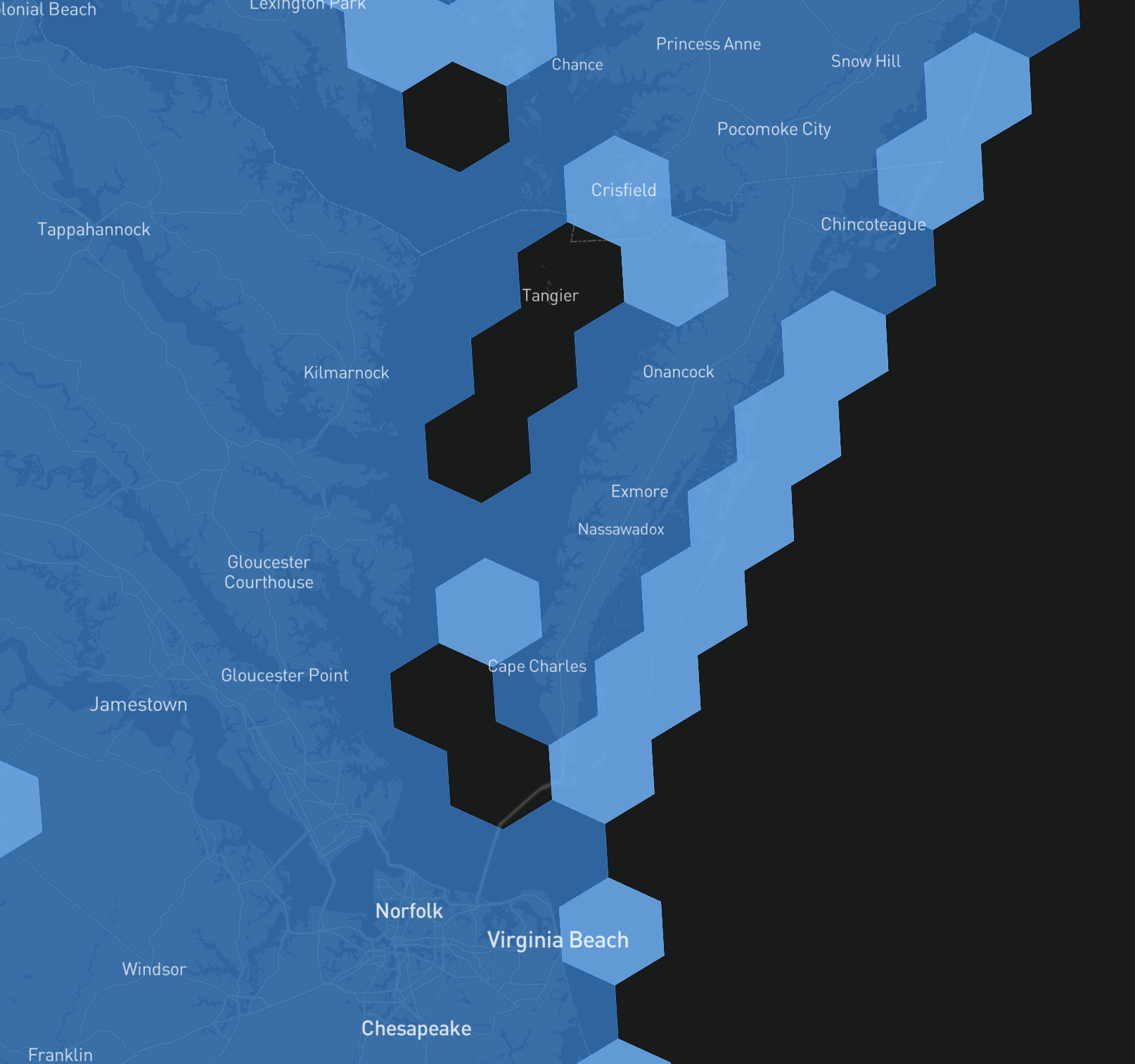 Blue backed areas you would still have service with a mobile plan while the black backed areas inside that same waterway are considered ocean data and would require the higher mobile priority plan.