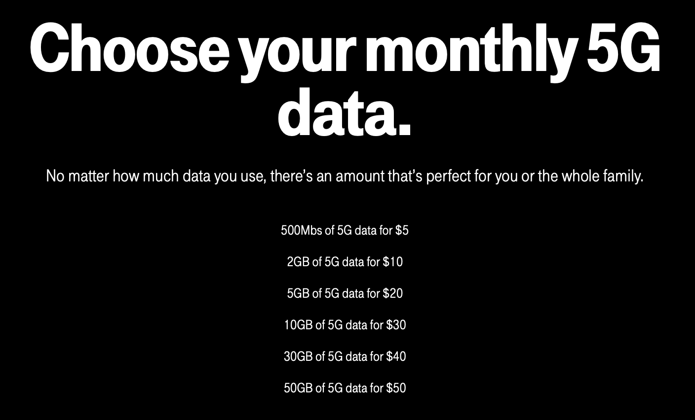 In March 2021 we discovered that the 100GB data plan was no longer available on T-Mobile's prepaid website. Instead, they now offer a 50GB/$50 plan.