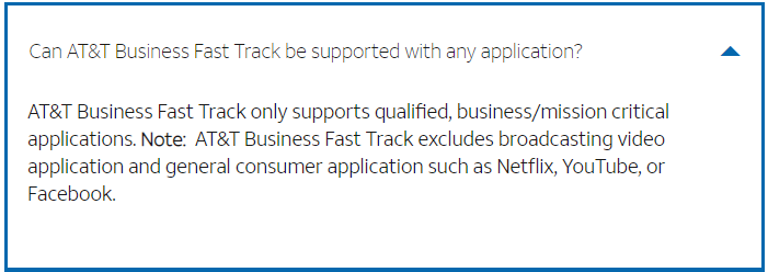 But don't expect to be able to use this enhanced priority for video streaming or "fun" applications - customers must coordinate with AT&T to set up Fast Track for their business-data and AT&T specifically prohibits streaming applications: