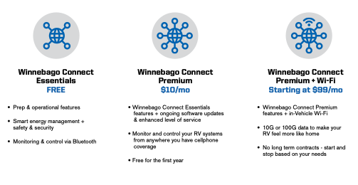 Winnebago Connect can control and monitor RV systems through a single platform. It will allow you to monitor power and climate systems, control lighting, and review maintenance reminders. It also offers optional cellular data packages.