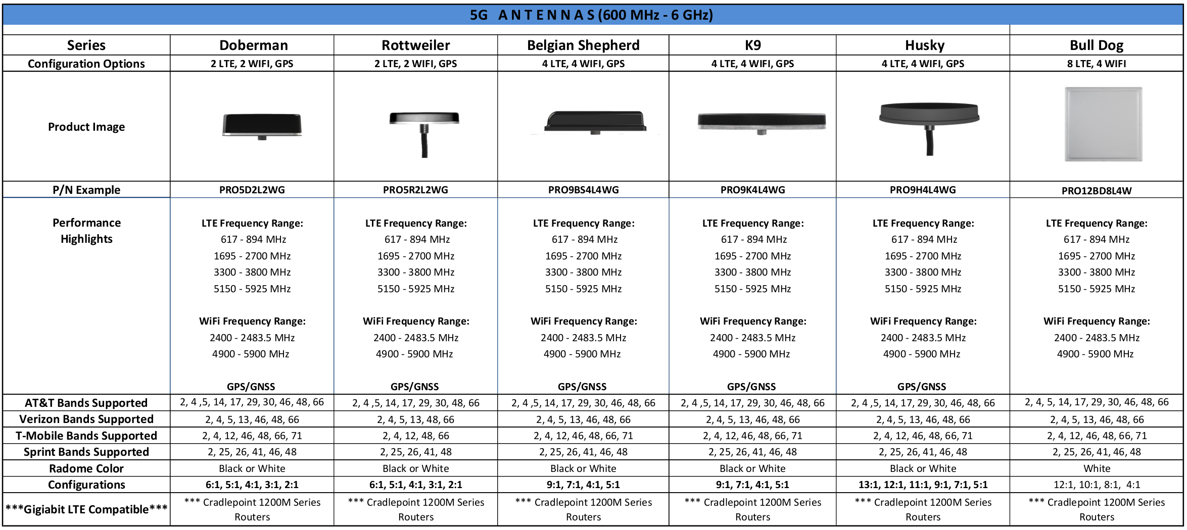 The antennas are named after dog breeds and come in a variety of customizable combinations from 2-in-1 up to 11-in-1. Depending on the specific antenna, the following options are available: