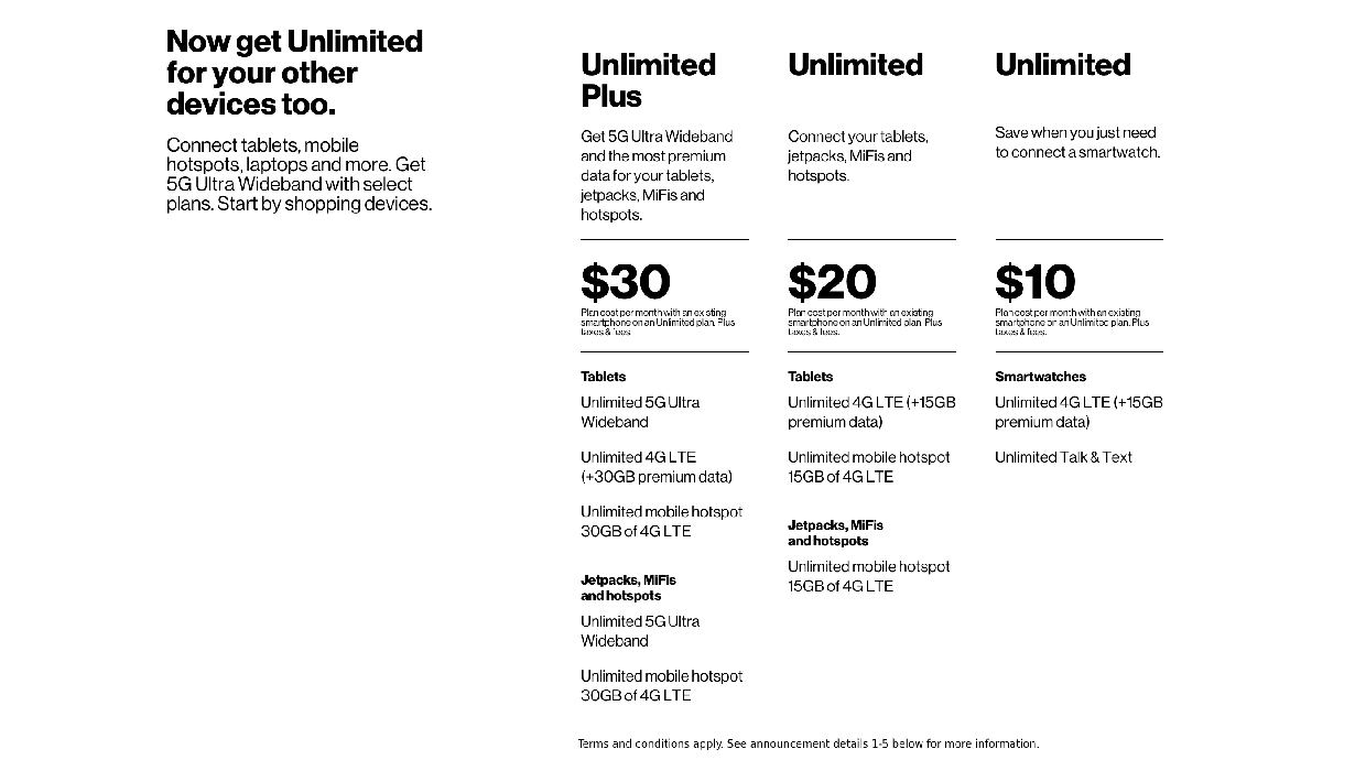 Both LTE and 5G connected device lines can be added as Unlimited or Unlimited Plus to Verizon's current line-up of unlimited Smartphone plans, or they can be activated as a standalone line.